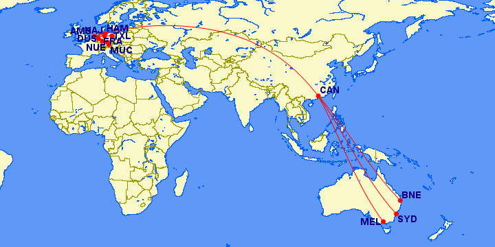 Ab Amsterdam geht es dann in einem A330 von China Southern nach Guangzhou in China und weiter mit einem A330 nach Australien. In China bleibt Ihr dabei im Transit. Die Umstiegszeiten sind unterschiedlich, daher probiert einfach mit der Suche etwas aus.