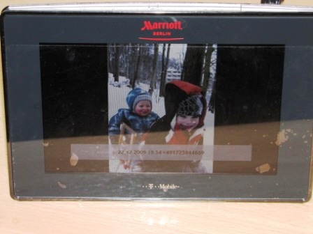 Das schöne daran ist aber: das Ding hat eine eigene Nummer. Man schickt also eine MMS mit dem gewünschten Foto an seinen Bilderrahmen (für alle die es probieren wollen: 0151 26 57 08 35) und schon erscheint dieses Bild mit Absender und Zeitstempel auf dem Display. Eine nette Idee um schnell mal einem eine Freude zu machen, wenn der Bilderrahmen auf dem Schreibtisch platziert ist.