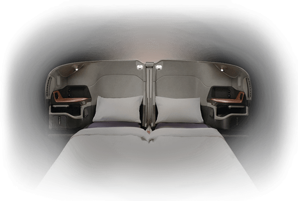 Wer zu zweit fliegt und nicht ans Fenster möchte, der kann sich in der Mitte ein Doppelbett bauen (lassen) und dort gemeinsam den Flug verbringen. Sieht nicht nur spannend und bequem aus, ist es wohl auch.